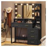 Makeup Vanity with Lights and Charging Station, Black Vanity Desk with Mirror and Lights, Makeup Table with 5 Drawers and Shelves, Vanity Mirror with Lights Desk, Black Wood Grain