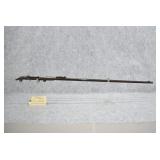 12. Harpers Ferry – Mod. 1808 – 69 Cal. Flintlock Musket – w/45” Round Barrel w/Barrel Band Blade Front & Fixed Rear Sights – Gray Finish – w/Straight Grip Full Length Wood Stock w/Metal Butt Plate & Iron Mountings – w/Ram Rod – Note: Stock Cracked Underneath in Front of Trigger Guard at Lock – Dated 1812