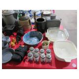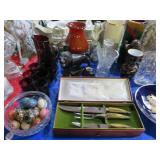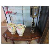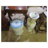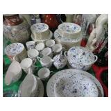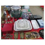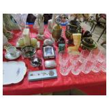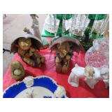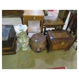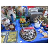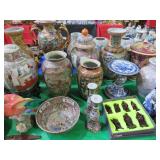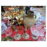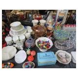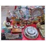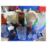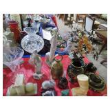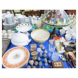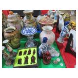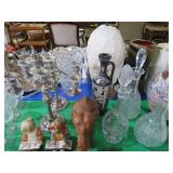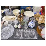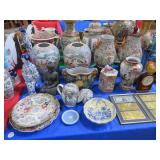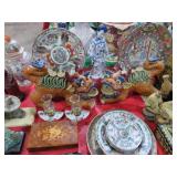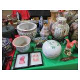 CHINA & GLASS: Lots of excellent Oriental ceramics! Dragon figurine pair; Rose Medallion; Earthenware Oriental teapots; Ginger jars; Blue & white umbrella holder; Oriental floor vases; Wall pockets; Fishbowl planters; Blue & white cake stand; Candlesticks; Decorated egg shape; Lots &lots of vases & planters; Nicely decorated bowl on stand; Rice bowls & much much more!; Teapots; Great pair of elephant garden seats; Floral decorated handled vase pair; Large Hummels; Greek design set; Rabbit; Collectible teacups & saucers; Dresser tray; Hummel ashtray; Fine dinnerware sets; Capodimonte style floral candleholders; Wedgwood; Covered casserole; Tidbit server; Floral name plate holder set; Stein; Trays; Dresden figures; Vases of all types; Lenox; Pitcher; S&P shakers; Equine decorated mug set; Gaping mouth fish planter pair; Transferware bowls; Holly leaf mixing bowl; Green lustres with gold accents; Perfume bottle; Crystal lamp; Paperweight; Waterford tumblers; Green cut to clear candy bowl; Fine crystal jar with lid; Art glass bowls; Crystal decanters; Glass candies; Crystal box with lid; Art glass snail; Swan server; Cordials; Art glass pistol; Lots of vases; S&P shakers; Ruby cut to clear decanter; Art glass vase; Ruby cut to clear pitcher & glasses; Shaving mug & brush; Blue glass horse; Crystal candlesticks; Basket; Tall cruet; Marmalade jar; Divided dish; Biscuit jars; Crystal bowls; Sugar & creamer; Pyrex measure and more!