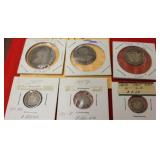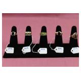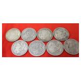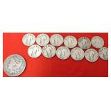 Sterling Silver, Gold, Coins, Stamps & Jewelry: Gold: (9) 14K & 10K Rings w/ Stones - Peridot, Red Garnet, Purple Amethyst, Fraternal Class Ring, Ruby/Diamonds, Peridot w/ Accent Stones, Yellow Garnet & Pearl; 24" 14K Chain, Sterling Silver: Charms, Rings, Bracelets, Pins & Pendants; Pocket Watch, Watches, Stick Pins, Men's Rings, NIB Watch Set Steinhasen Watch Set & Many Costume Jewelry Lots, Coins: (9) Morgan Silver Dollars - 1879-S, 1887-O, 1899-O, 1884-S, 1882-S, 1921, 1889, 1921 & 1901-O, (12) 40% Silver Kennedy Halves, (4) Peace Dollars, (12) Standing Liberty Quarters, (4) Benjamin Franklin Halves, 1853 Half Dime, 1857 3¢ Piece, 1857 Dime, 1808 Capped Bust Half Dollar, 1854 Quarter, (33) V-Nickles & (11) Walking Liberty Halves.