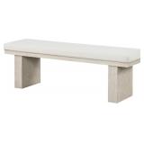 - The upholstered bench matches the table's wire-brushed chevron design and plinth base.