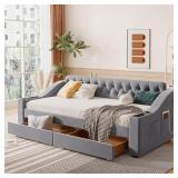 Dolonm Upholstered Full Size Platform Metal Bed Frame with Four Storage Drawers Mattress Foundation with Wooden Slats Support, Gray Linen Sponge Soft Bag Platform Bed