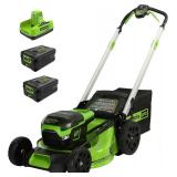 (69). Greenworks 60V 21” Cordless (Self-Propelled) Lawn Mower (LED Lights + Aluminum Handles), 2 x 4.0Ah Batteries and Dual Port Rapid Charger