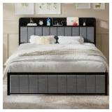 VECELO Bed Frame, Gray Metal Frame Queen Platform Bed Upholstered Headboard with Storage Charging Station, Sturdy Metal Slats