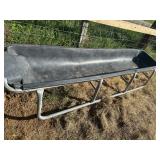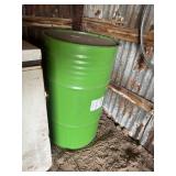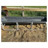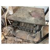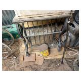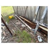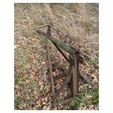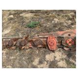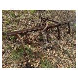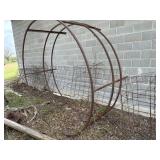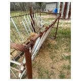 OLDER ITEMS* 2 pairs iron wagon wheels, Cast Iron Garden Table & Chairs, metal trash can and bucket, drag spike harrow, Sheppard Hook,