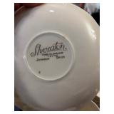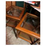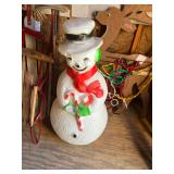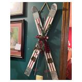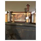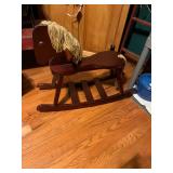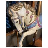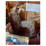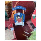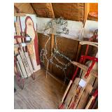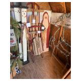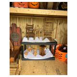 Assorted wine glasses Carousel horse Antique ice cream freezer Antique candlesticks Willow Tree figurines Roosters Black primitive lighted cabinet Large curio cabinet Johnson Bros China Cookie Jars #3 Crock butter churn TV trays Christmas sleighs Toboggan Sleds