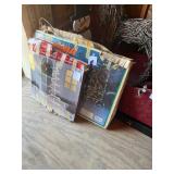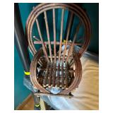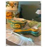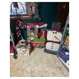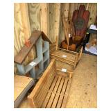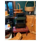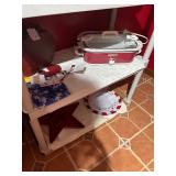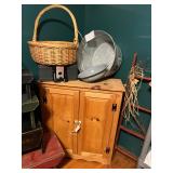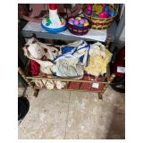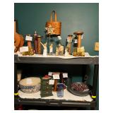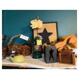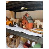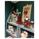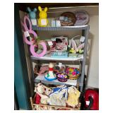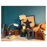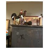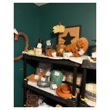 Pioneer Woman crock pot, pots & pans, & a few other pieces Primitive decor Small cabinet Small doll chairs Baskets Wash tub Armoire Gone With the Wind Dolls Primitive stools Assorted housewares Porcelain dolls Easter items Lots of Holiday items