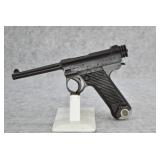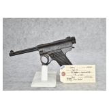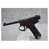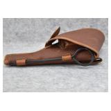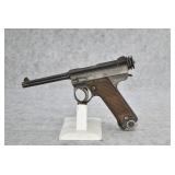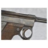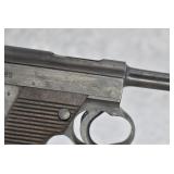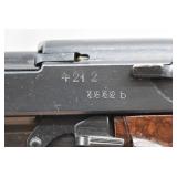 502R. Japanese – Type 14 Nambu – 8mm Nambu Cal. Semi-Auto Pistol – w/4 5/8” Barrel w/Blade Front & Notch Rear Sights – Military Finish – w/Grooved Wooden Grips – w/Detachable Magazine – w/Correct Period Leather Holster, Note: Inner Flap of Holster for Ammo Storage is Only Holding on by a Few Threads, Very Fragile! – Mfg. Dec. 1943 – Serial #4368 (C&R or FFL Required)