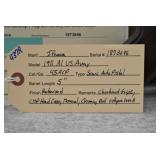 515R. Colt – Mod. 1911 US Army – US Property Marked – 45 Auto Cal. Semi-Auto Pistol – w/5” Barrel w/Blade Front & Adj. Rear Notch Sights – Military Finish – w/Diamond Checkered Wood Grips – w/Factory Detachable Magazine – w/Lanyard Loop – Serial #608146 (C&R or FFL Required)
