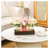 Centerpiece Table Decorations - 3Pcs Roses Artificial Flowers in Mason Jars with Wood Tray