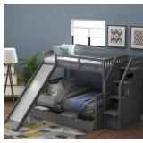 (83) Gray Twin over Full Bunk Bed with Drawers, Slide, and Storage Staircase **3 Boxes**