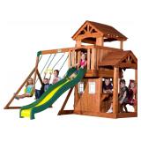 (13) Backyard Discovery Tanglewood Cedar Wood Swing Set with Wave Slide, Clubhouse, Playhouse, Covered Snack Bar Window, Bench, Rock Wall Ladder, Belt Swings, Trapeze, Porch, Step Ladder, Outdoor Playset - 2 boxes