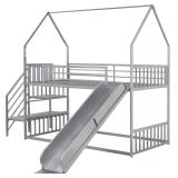 *INCOMPLETE*Twin Over Twin Metal House Bunk Bed with Convertible Slide and Stairs, Heavy Duty Low Floor Bunk Bed House Bed Frame Twin Size with Roof and Safety Guard Rails for Boys and Girls, Silver