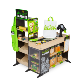 - Grocer and shopper role-play items include apron, conveyor belt divider bar, and a cloth shopping bag; play money, play grocery boxes and cans; a fully stocked grab-and-go rack (gum, granola bar, a magazine, and more!); write-on signs, cards, and coupons