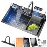 Waterfall Kitchen Sink,Stainless Steel Single Bowl Digital Display Smart Drop In Kitchen Sink With Various Accessories (Dark Gray, 31.5"x17.7"x8.7")