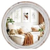 24 Inch Round Mounted Wall Mirror, Farmhouse Circle Decorative Mirror with White Wash Beads, Wooden Frame Rustic Boho Mirror for Bedroom, Bathroom, Living Room, Entryway Decor
