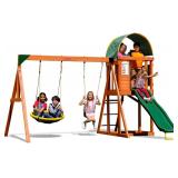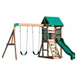 - OUTDOOR FUN: Sportspower Amelia Wooden Swing Set is feature-packed with a 6ft blow molded slide, a 2-person saucer swing, 1 height adjustable swing, 1 sandbox (sand not included) and 1 playfort with UV-resistant canopy. Up to 5 kids can play at once, 500 lbs maximum weight