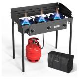225,000 BTU ★ Stove give off a strong flame that can be adjusted easily. Heat is controlled by a CSA approved regulator, which is more safety and longer working time. Three burner make it possible to cook more food at the same time, 75,000 BTU for each burner. STURDY FRAME ★ This outdoor cooker is made from cast iron, which can support all kinds of cooking. Great for canning, home brewing, wok cooking, crawfish boil and turkey frying. EASY OPERATION ★ Just connect the tank, open the main valve, hold a long match next to the burner, turn the control valve, and tweak the vent cover if the flame is too yellow. SIMPLE ASSEMBLY & STORAGE ★ Put together 4 legs & windscreen, then hook it up with propane gas, then you get an awesome extra cooker. Top working measures 34.3’’ long 17.7’’ wide. Extra Carrying bag for convenient carrying out and storage! (Gas tank IS NOT included.)