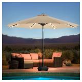 wikiwiki 11FT Solar Led Patio Umbrella with Base, Sturdy Outdoor Market Umbrella for Deck, Pool, Garden w/Tilt, Crank, 32 LED Lights, Beige