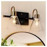 Uolfin Transitional Cone Bathroom Vanity Light 2-Light Modern Black and Brass Wall Sconce with Seeded Glass Shades