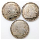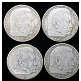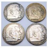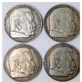 • German WWII Chancellor Paul von Hindenburg 5 Mark Silver Coins, Four (4)