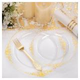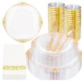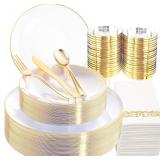 Nervure 350PCS White and Gold Plastic Plates - Gold Disposable Dinnerware Sets - Plastic Silverware - 100Plates, 150Plastic Cutlery, 50 Cups and 50 Napkins for Wedding & Party & Christmas