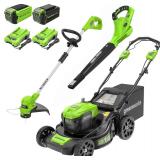 (12). Greenworks 40V 21" Self-Propelled Mower,Axial Leaf Blower,12" String Trimmer with Batteries and Chargers