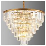 - K9 CRYSTALS & DURABLE ANTI-RUST METAL FINISH: The top-quality K9 crystals of this luxury crystal chandelier have higher light transmittance, and go with the solid metal frame in painted gold that features a classic modern look. Seven tiers of crystal shape combine fancy and elegant elements with eye-catching results, enhancing the luxury & sparkling effect.