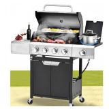 Portable Gas Grill w/Side Burner, 4-Burner Stainless Steel Propane Grill 51,000BTU, Outdoor Patio Camping Barbecue Grill with 4 wheels, Electronic Ignition, Built-in Thermometer