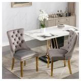 MSRP $252.99 This dining chair is a perfect blend of modern design and luxurious comfort. The velvet upholstery not only provides a soft and plush seating experience but also adds a touch of elegance to any dining area. The stainless steel legs offer a sleek and contemporary look, while the nailhead trim along the edges further enhances its stylish appeal. With its sturdy construction, this chair is built to last and can withstand the rigors of daily use. Whether you're hosting a dinner party or enjoying a meal with your family, this chair will make a statement and elevate the overall ambiance of your dining space. Its ergonomic design ensures proper support for your back and body, allowing you to sit comfortably for extended periods. The combination of velvet, stainless steel, and nailhead trim makes this chair a truly unique and eye-catching piece that will enhance the aesthetic of any modern home.