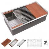 - SPACE-SAVING ACCESSORIES - Package including a 33 inch undermount sink; solid WOOD CUTTING BOARD; custom COLANDER with wood handle; Stainless ROLL UP DRYING RACK for drying dishes; BOTTOM RINSE GRID with extra rubber foot for optimal draining prevents scratches; DRAIN ASSEMBLY with lid cover, Hardware, Template paper and installation manual.