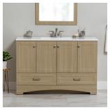 (23). Spring Mill Cabinets Emlyn 48 Inch Bathroom Vanity with White Single-Sink Top, 3 Cabinets, 2 Shelves, 2 Drawers, 48.5" W x 18.75" D x 32.89" H, Sandy Oak