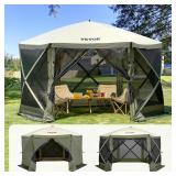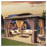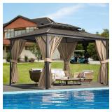 (62). Aoxun 10'x12' Hardtop Gazebo, Aluminum Frame Permanent Pavilion with Netting and Curtains, Outdoor Polycarbonate Double Roof Canopy with Ceiling Fan, Designed for Lawn, Garden, Patio, Brown