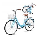 Ktaxon 26in Folding Beach Cruiser Bike for Women, 7-Speed City Commuter Bike with Lock, Basket & Rack, Blue