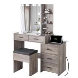 1:Aesthetics and Practicality:VINGLI rustic gray vanity desk with mirror and lights is a seamless fit for your furniture, boasting a minimalist design with sleek lines. It offers 3 open compartments for your daily cosmetics and decor, while the 5 drawers keep your tabletop clutter-free
