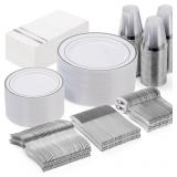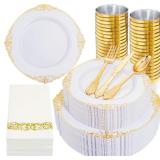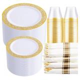 SERVE FOR 30 GUESTS: This 210 pieces gold disposable dinnerware set includes 30 gold plastic dinner plates 10.25”, 30 plastic appetizer plates 7.5”, 30 gold plastic glasses 9 oz, 30 pre rolled napkins , 30 forks, 30 spoons, 30 knives.