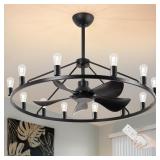(217) KINGTORO Modern Black Ceiling Fan with Light Black, 7 Blades Ceiling Fan, Remote Control, Glass Lampshade, 5 E26 Sockets, 3 Adjustable Speeds, Reversible Blade Direction, Wall Switch F491BK-12