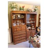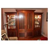 - Large hand built entertainment wall unit with display cabinets, possibly cherry wood?