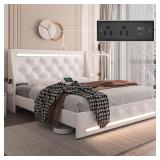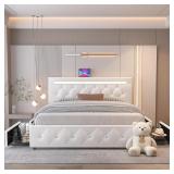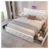 Full Size Bed Frame with 4 Drawers and LED Light, Charge Station, PU Leather Upholstered Platform Storage Bed with Adjustable Headboard, Wooden Slats Support, No Box Spring Needed, White