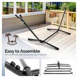 Create a perfect relaxation spot with this completehammock with stand and pillow. Featuring a sturdy powder-coated steel frame that supports up to 600 lbs, this hammock with stand for outside is built to withstand various weather conditions. The water-resistant polyester fabric ensures durable outdoor seating solutions, making it ideal for poolside lounging, gardens, patios, backyards, and camping hammock adventures.