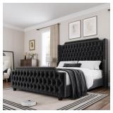 HOSTACK King Size Platform Bed Frame with 54" Tall Wingback Headboard & Deep Button Tufted Footboard, Velvet Upholstered Bed Frame with Handmade Pleats, Nailhead Trim, No Box Spring Needed, MIDNIGHT BLUE (ALMOST BLACK IN COLOR)