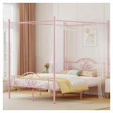 Weehom Full Canopy Bed Frame with Headboard and Footboard, Four-Poster Metal Canopied Platform Bed Mattress Foundation Underbed Storage Space No Box Spring Needed for Girls Adults Pink
