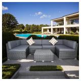 (12) Homestyles 6801-40 Boca Raton 4 Outdoor Sectional Sofa Seating, Weatherproof Woven Wicker Rattan with Acacia Wood Accents, Grey/Brown