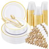 - 700pcs gold plastic plates for 100 guests. Include: 100 Dinner Plates, 100 Dessert Plates, 100 Pre - Rolled Napkins with Silver Silverware, 100 Cups. It is great Plates and Napkins Party Supplies.