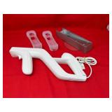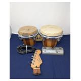 Lot #26 - Includes a pair of bongos with a CB logo, a Vox pedal with a cable, and a Fender Stratocaster headstock.