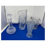 Lot #89 - Crystal Glassware Lot - Decanter, Pitcher, and Flower Vases.