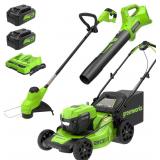 (70). Greenworks 48V (2x24V) 20" Brushless Mower+12" String Trimmer +320CFM Blower,(2) 4.0Ah Batteries and 4A Dual Port Charger