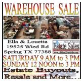 To sort and clean Buyout items, we leased a 3,400 sq ft warehouse… TOO SMALL with ALL the jobs! Added another 5,200 sq ft warehouse… NOW, they are both FULL but must give up the smaller one! Come on, we HAVE TO liquidate the small one. ALL MUST GO! Get the bargains! 19525 Wied Rd Spring TX 77388 (2.5 miles WEST of I-45 on Louetta Rd, NORTH on Ella) Saturday 9 AM to 5 PM Sunday 12 NOON to 5 PM --/-- ½ price / 50% Off on EVERYTHING under $50 We get many calls a day to help folks liquidate their Estates before ‘moving on’! From most, there is a reason that an Estate Sale cannot be held… they still need the money, so we do a ‘buyout’. Packing it all up and moving it creates much labor and transportation expense! It ALL must be sold to pay them for their transitioning. For these services, we have a ‘Brick and Mortar’ Store AND Warehouse. We perform ‘on site’ Estate Sales at the home almost every week… sometimes two (AllAboutEstateSales.com). At these locations, we do NOT offer ‘leftovers’, if an items does not sell at the Estate Sale – Why would we want it at the Store or Warehouse? These are true Buyout items. With limited RETAIL square feet, it would NOT be good to sit a generator next to a leather sofa… a table saw next to a china cabinet… a rake and shovel next to silverware! These items and the like are offered for sale at the warehouse periodically; THIS IS THIS SALE!
