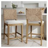 Nathan James Beacon Bohemian Boucle Bar Stool, Upholstered Counter Height Chair with Solid Wood Frame and Woven Seagrass Back for Kitchen Island, Light Brown/Seagrass/Cream Boucle, Set of 2