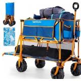 CARE FOR KIDS: The wagon stroller is designed with 5-point harness with shoulder and buckle pads for peace of mind and comfort for children; made of premium 300D polyester fabric and heavy duty steel frame that can hold up to 110lbs( 55lbs per seat ). A removable UV 50+ protected canopy with reflective strip to provide shade for your kids. All wheels have one step foot brakes to help you control the direction. Our foldable wagons have the JPMA certified meet ASTM standards.
